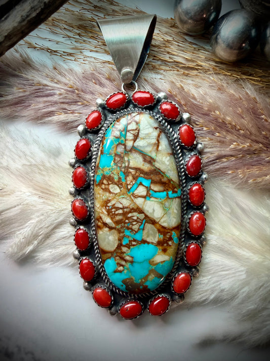 Boulder Turquoise & Red Coral Cluster Pendant