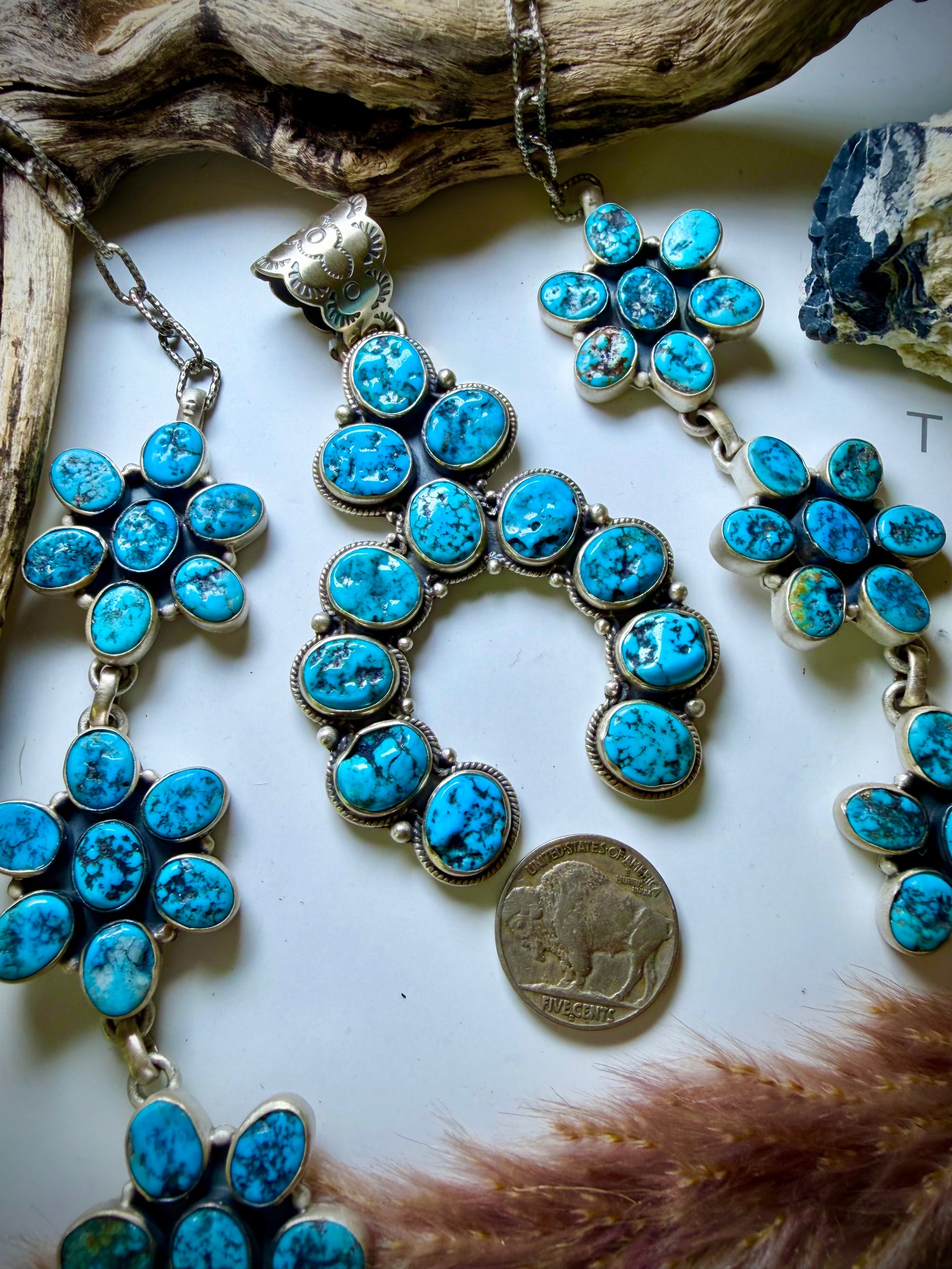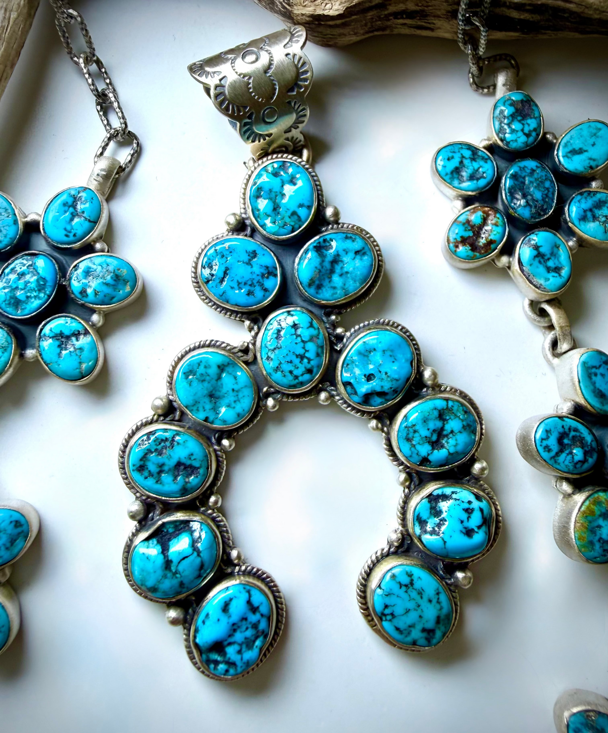 Handmade in New Mexico, this striking naja features 13 rough-cut Kingman turquoise stones, each full of natural texture and that bold Kingman color. The rope-border detailing and sterling pearl accents give it that classic Western silverwork finish.