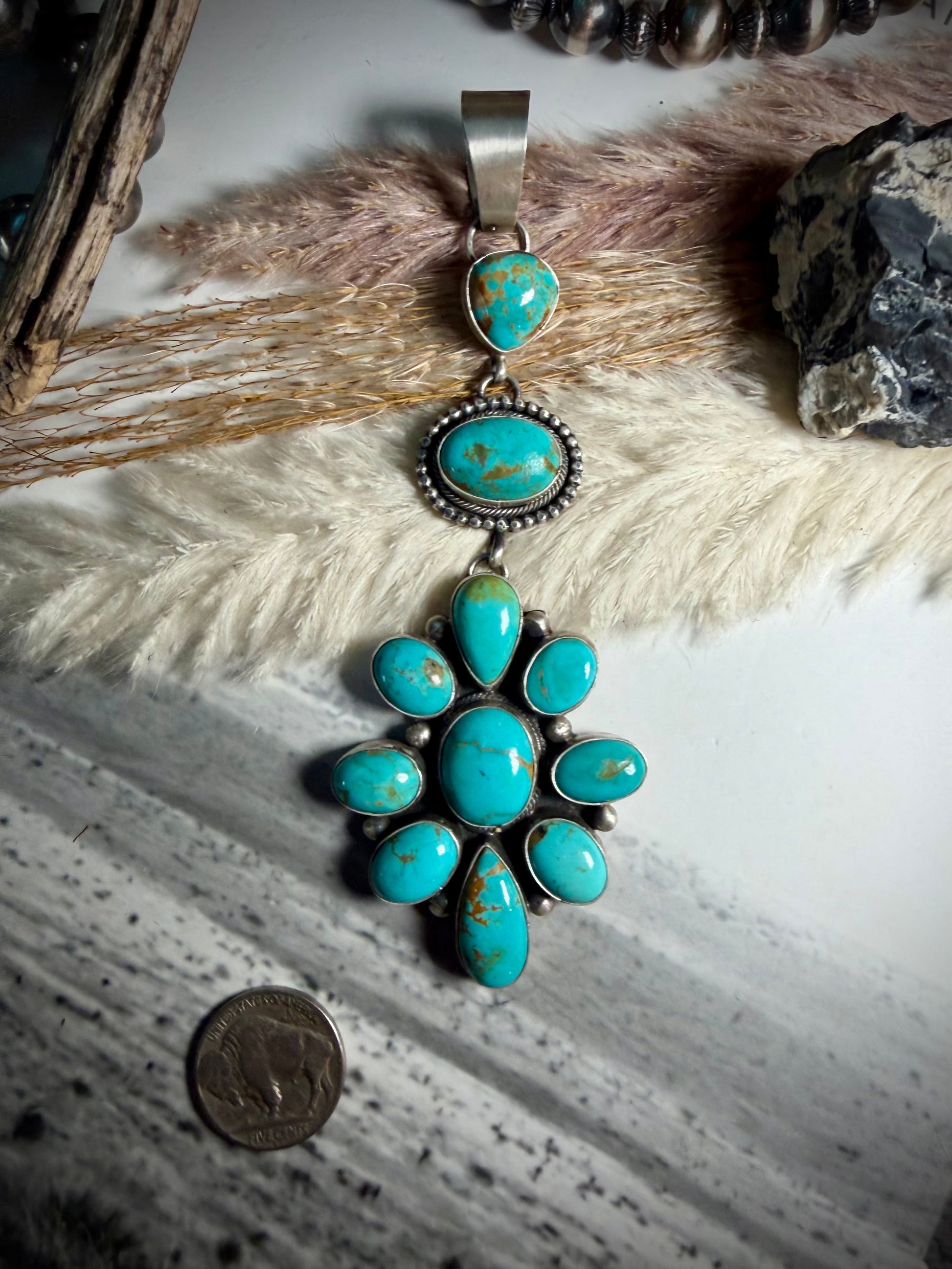 - Including the bale this beauty measures 5" long by 1 3/4" at the widest point of the Cluster Pendant