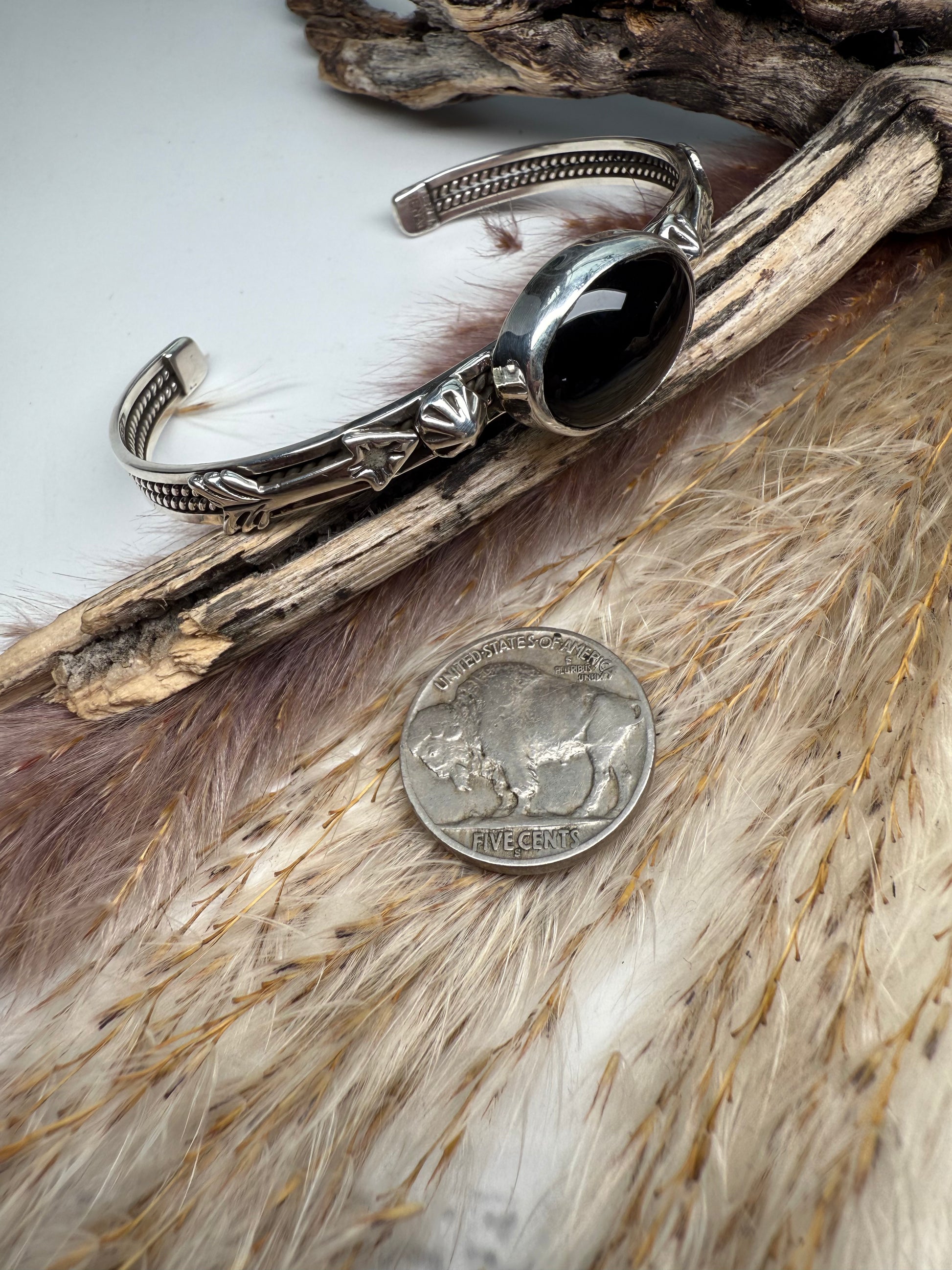 Bold and timeless, this sterling silver cuff features a striking black onyx stone — a classic statement with a sleek, modern edge. Perfect worn solo or stacked, it adds just the right touch of contrast to your silver collection.
