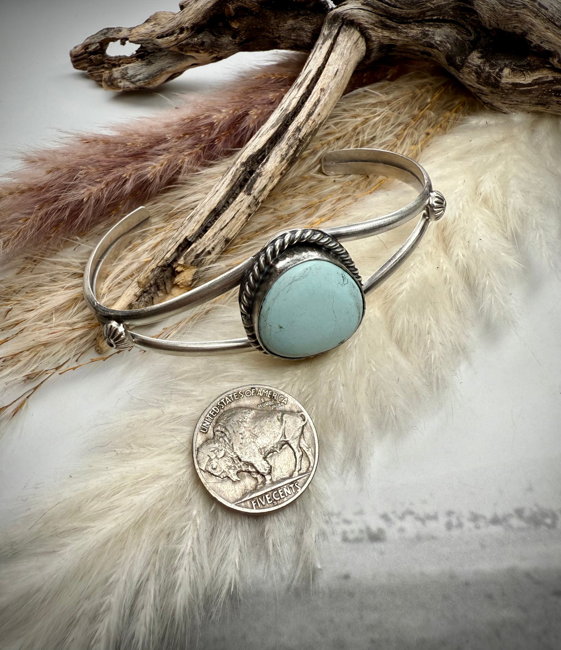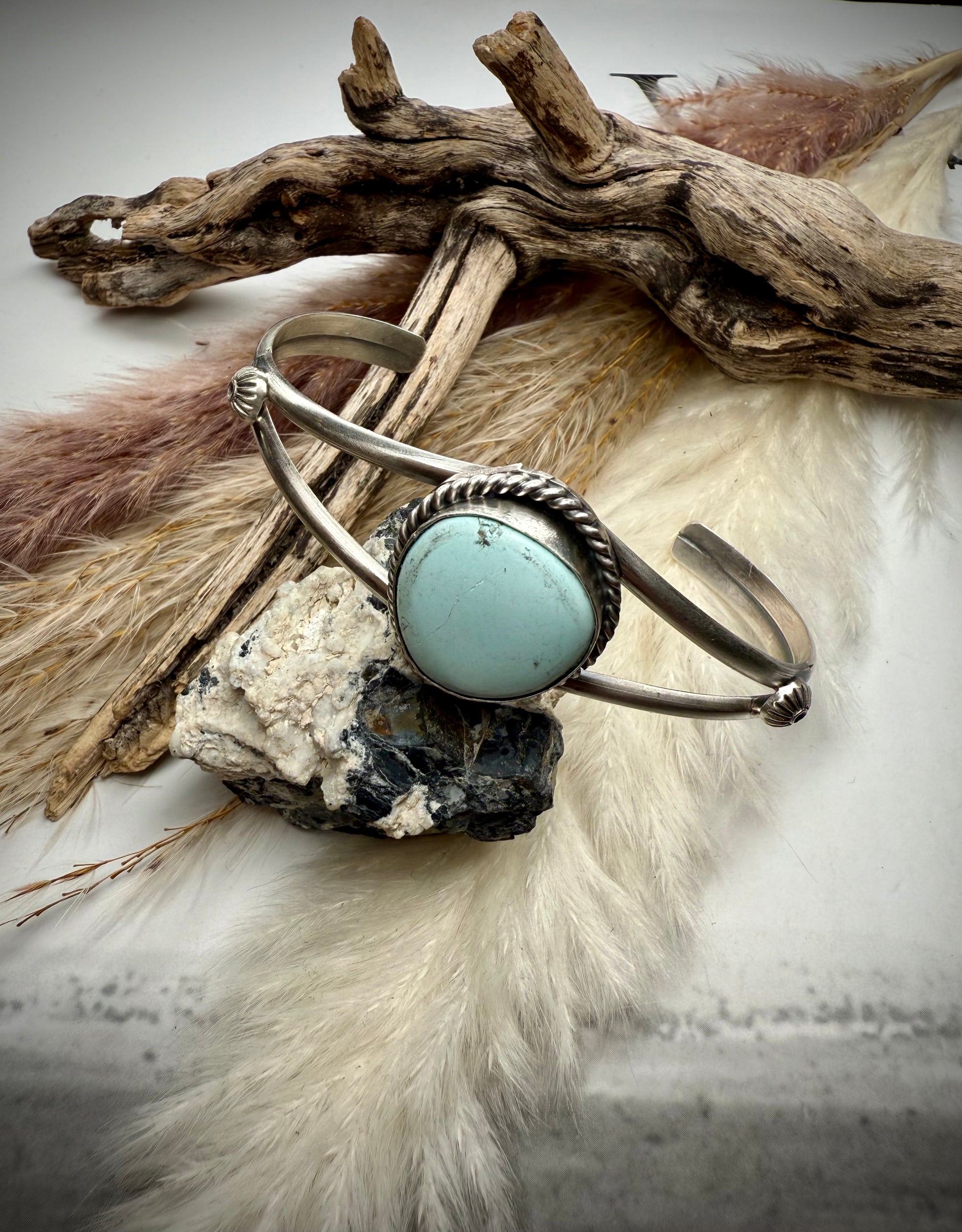 From the Dry Creek Vault — a true collector’s piece. This handmade sterling silver cuff by renowned silversmith Boyd Ashley showcases rare Dry Creek turquoise from a long-closed mine. Stones this special are few and far between, and we never know if we’ll ever find more.