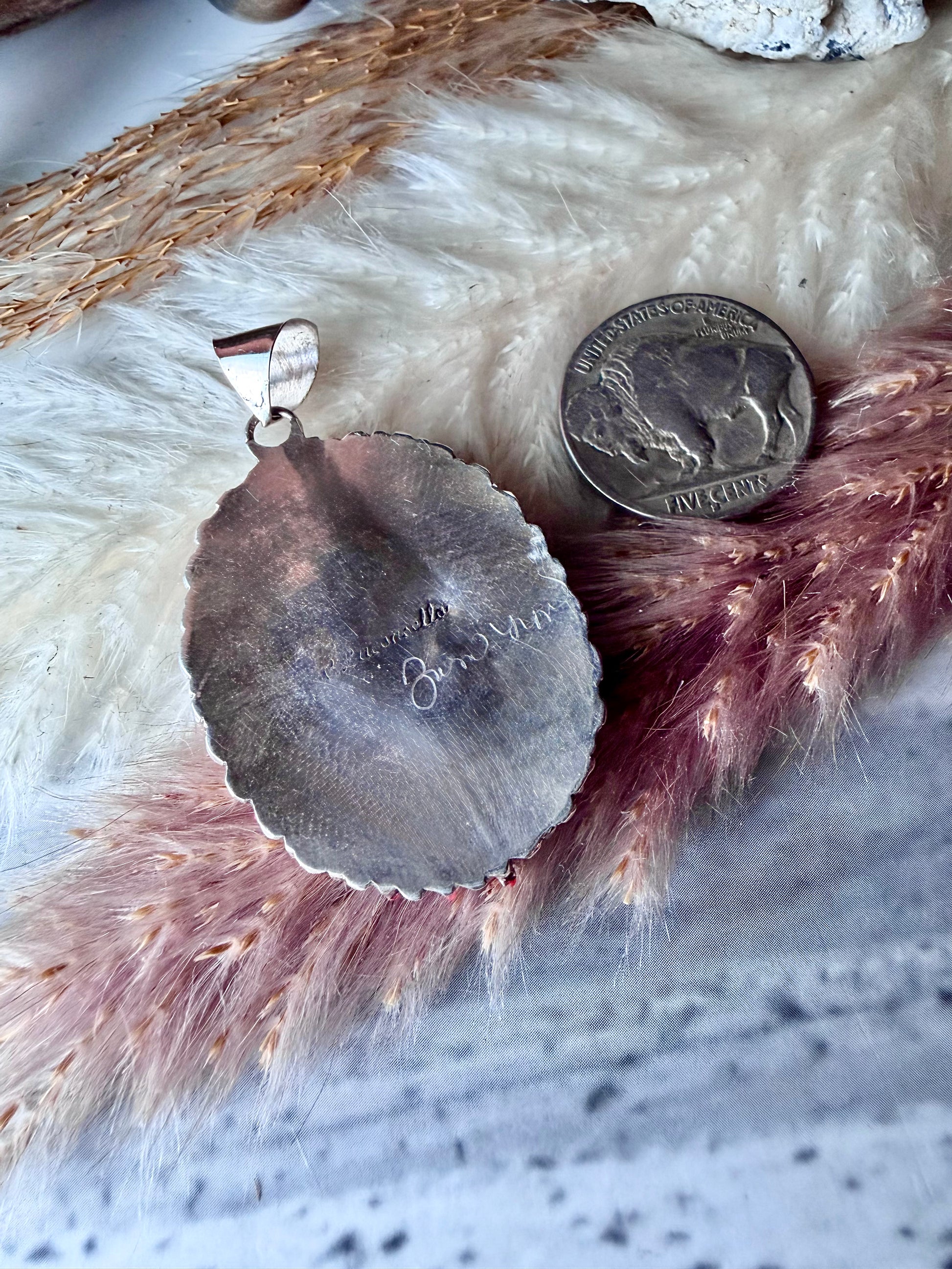 - Pendant measures approximately 1 3/4" long (bail included) by 1 1/4" wide