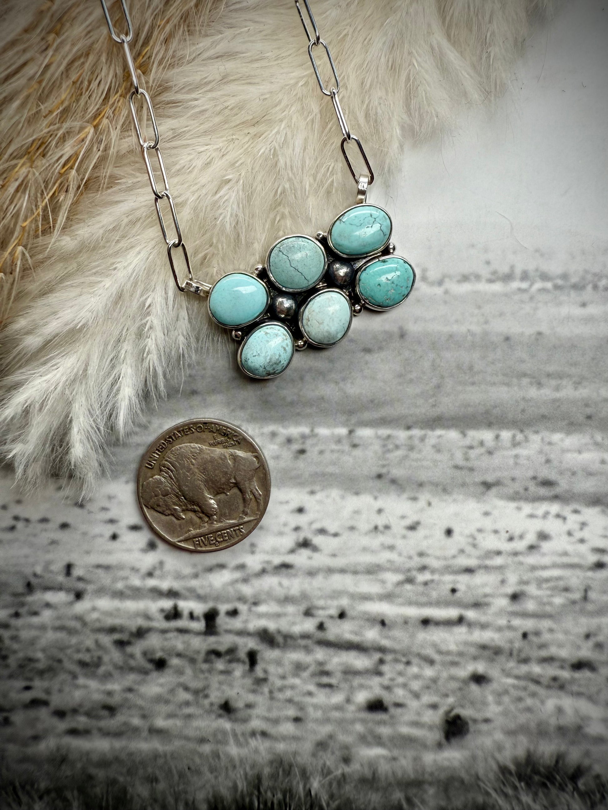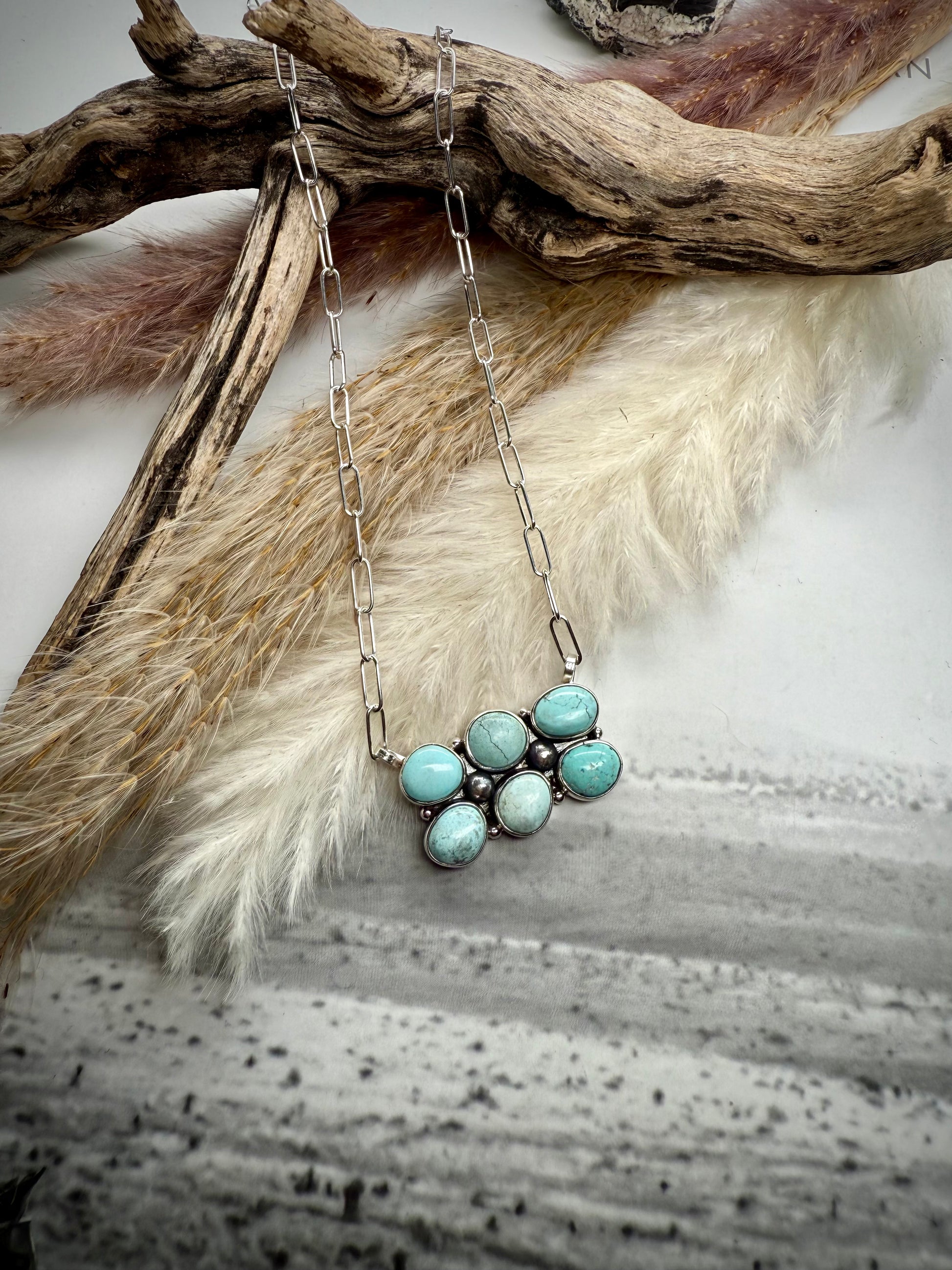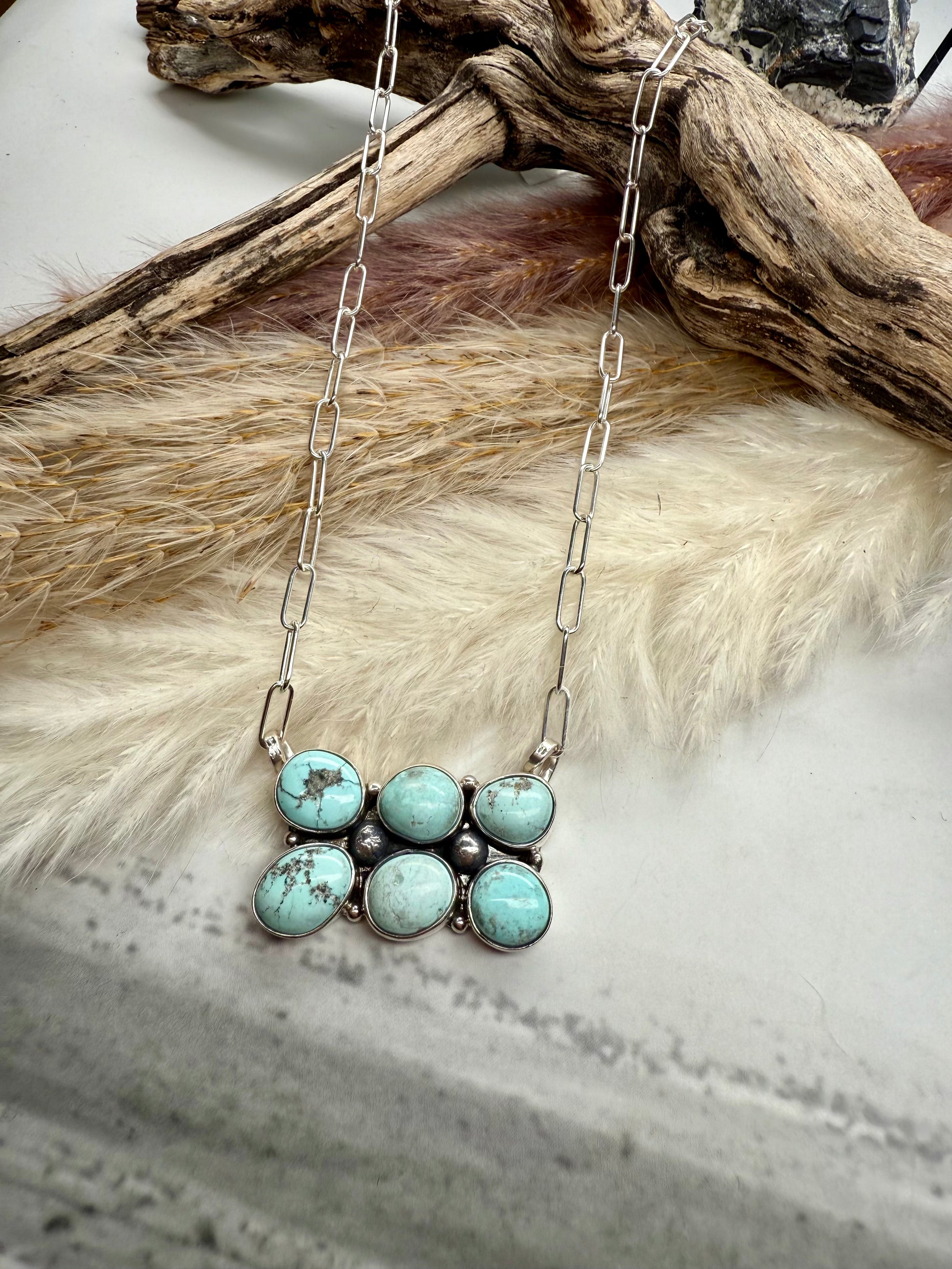Straight from the Dry Creek Vault — a rare treasure you may never see again. These handmade sterling silver necklaces feature six natural Dry Creek turquoise stones arranged three across in two rows, set on an adjustable paperclip chain. The Dry Creek mine has long been closed, and pieces this special are few and far between — we never know if we’ll ever find more.