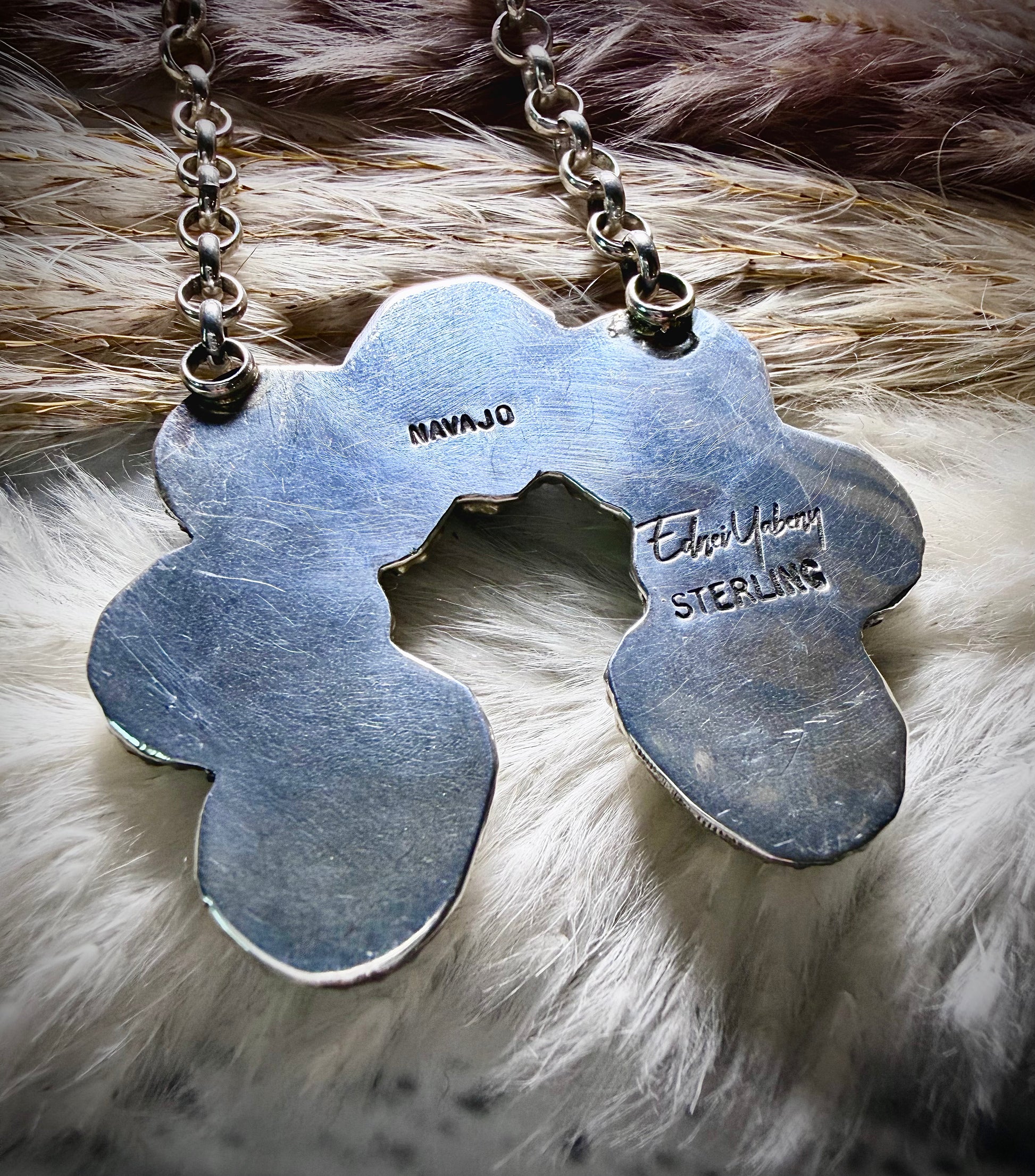 Handmade by Navajo artist Ednei Yabeny, this 7-stone Golden Hills turquoise naja is a true beauty. Each stone is a softly shaped teardrop, set in polished sterling with Ednei’s signature clean silverwork. The stones glow in shades of pale periwinkle and soft lavender-blue — a color that only Golden Hills turquoise can bring.