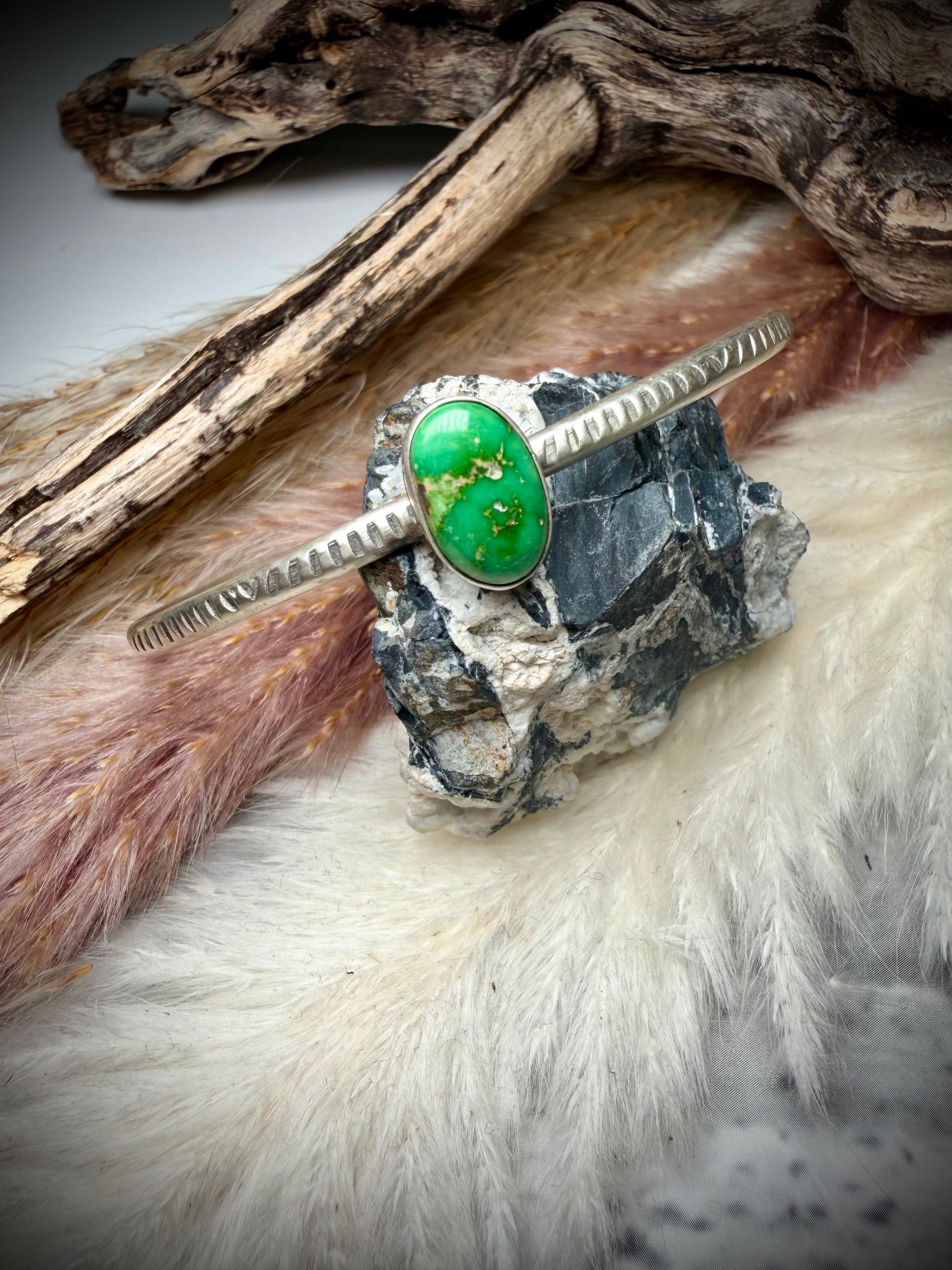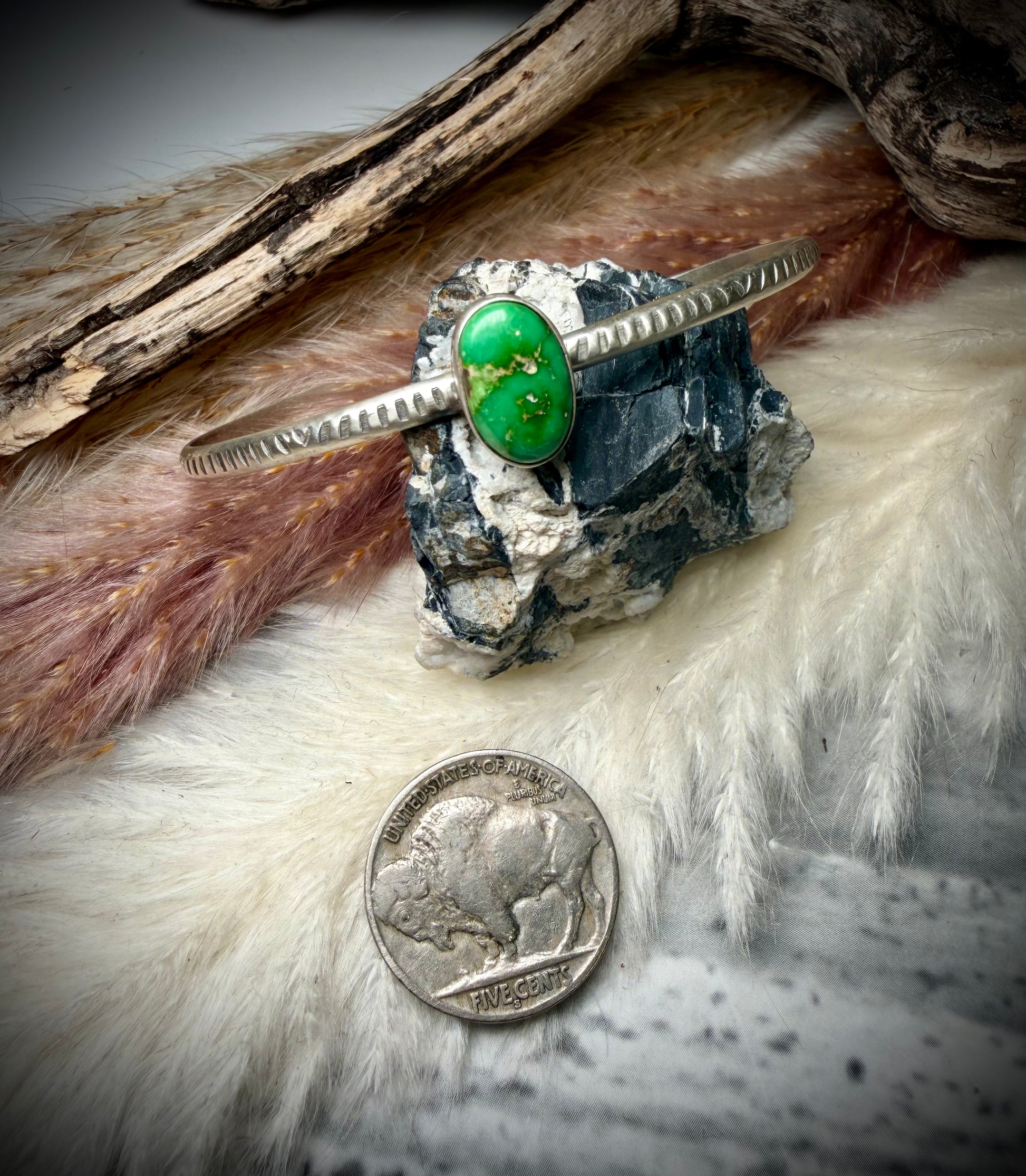 Native made dainty stacker bracelet with bright green Sonoran turquoise. Lots of flex, will fit most wrists. Currently measures 6" around with a 1" gap.