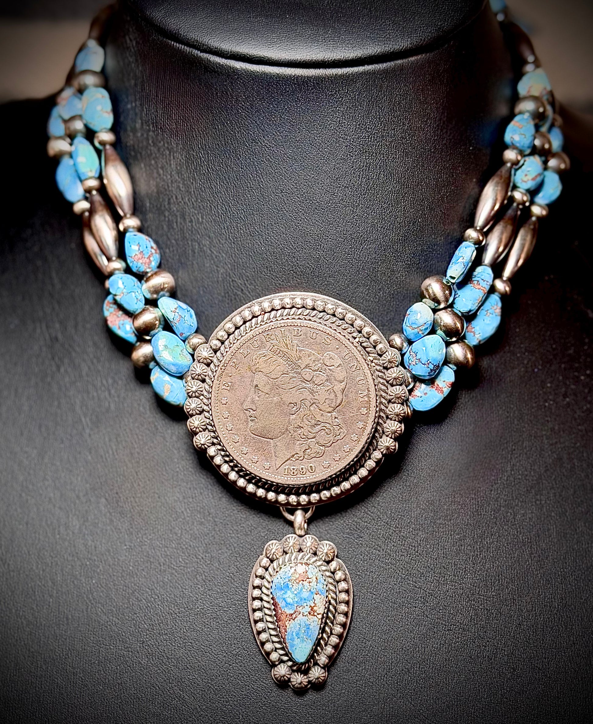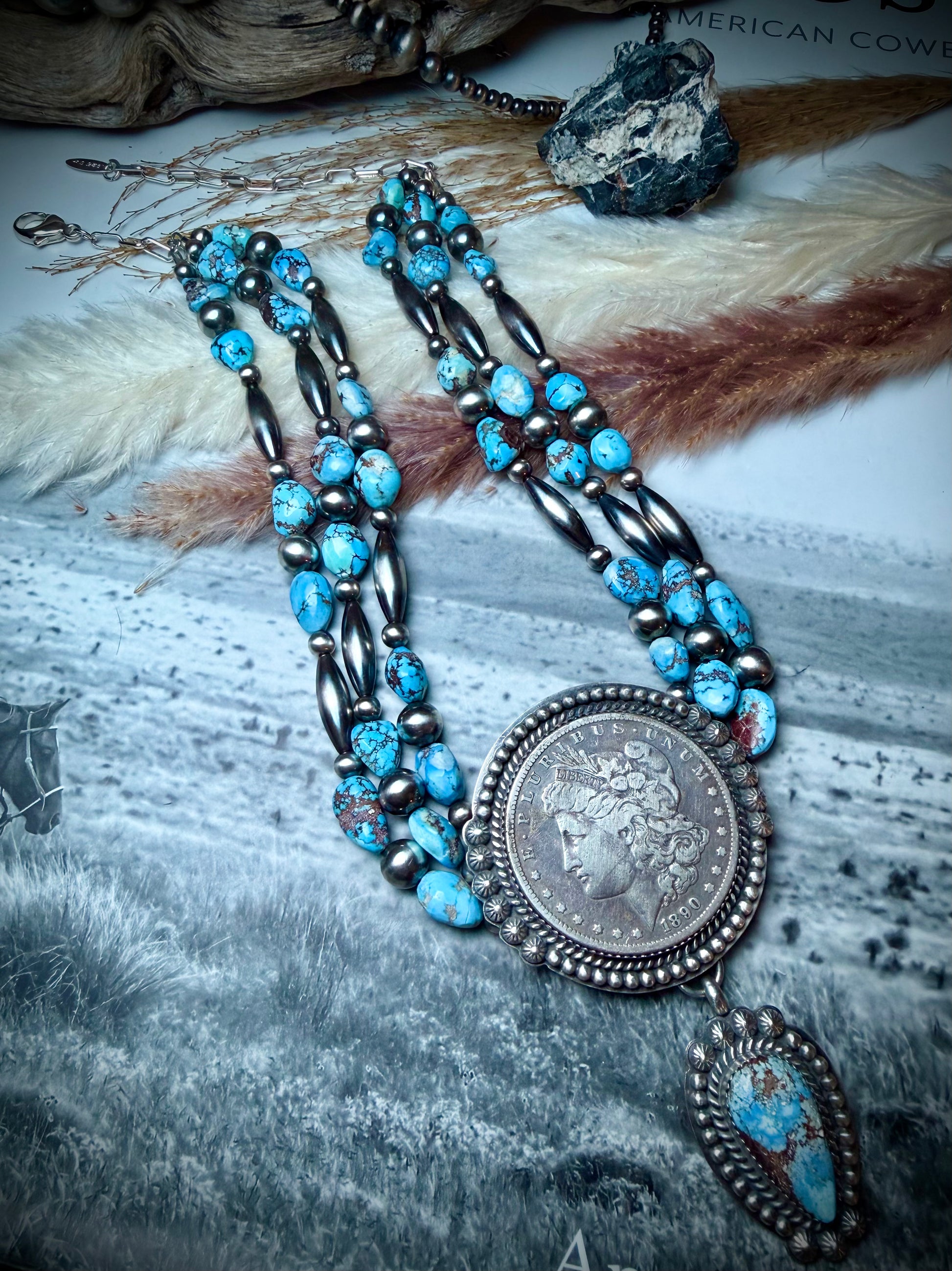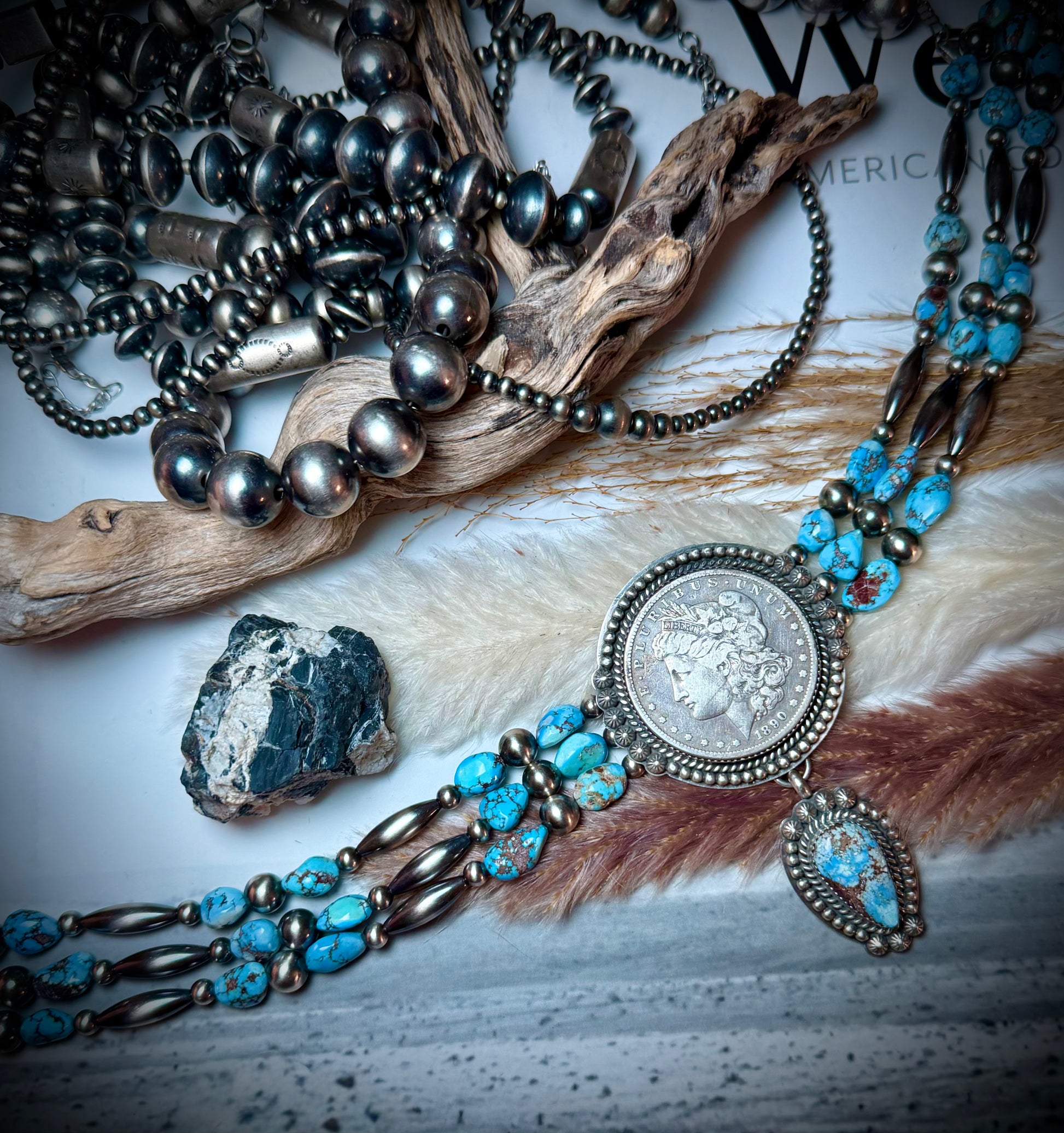Triple strand Golden Hills beads with a vintage 1890 Morgan Dollar at the center, finished with a dangling Golden Hills drop.