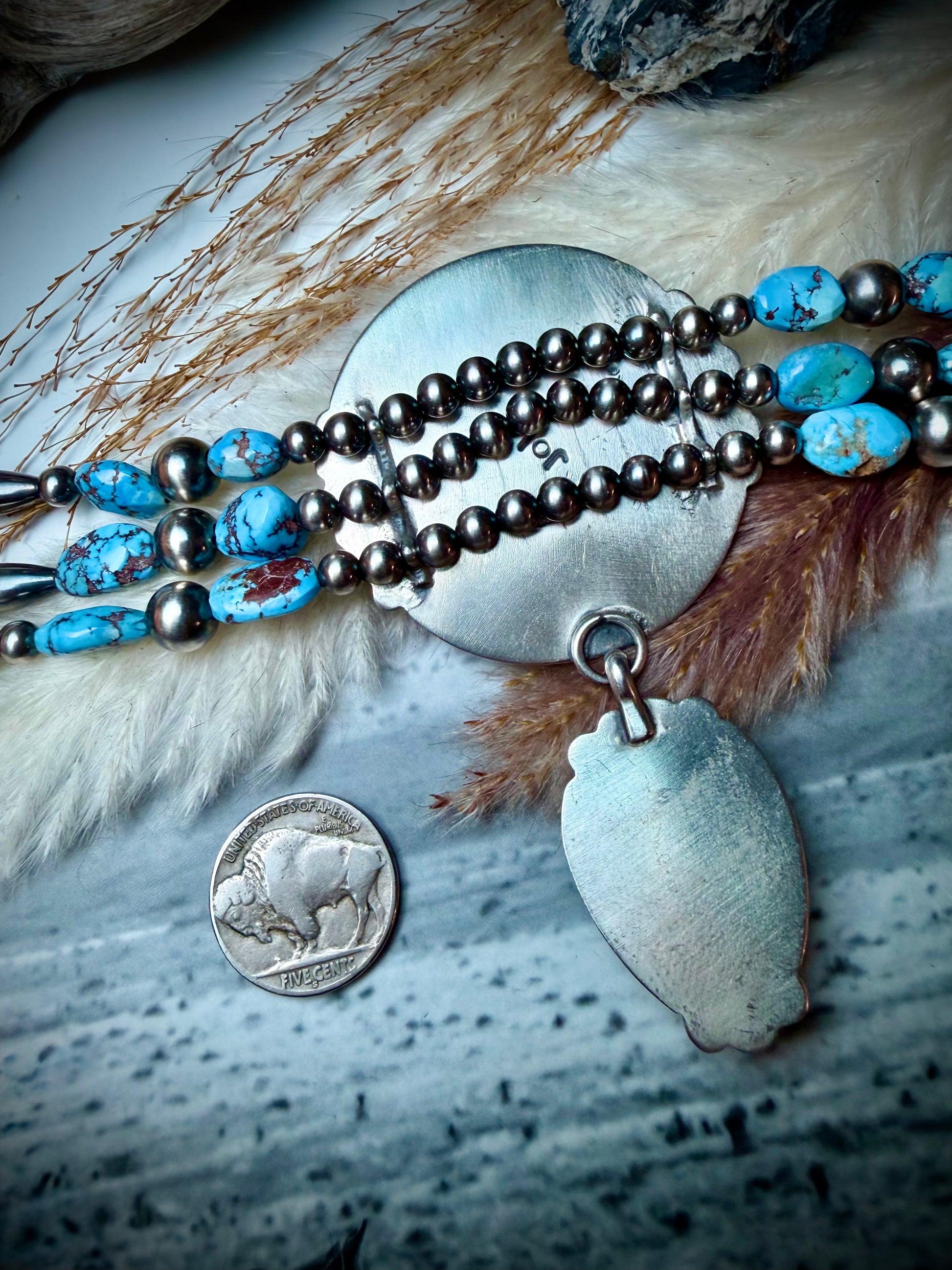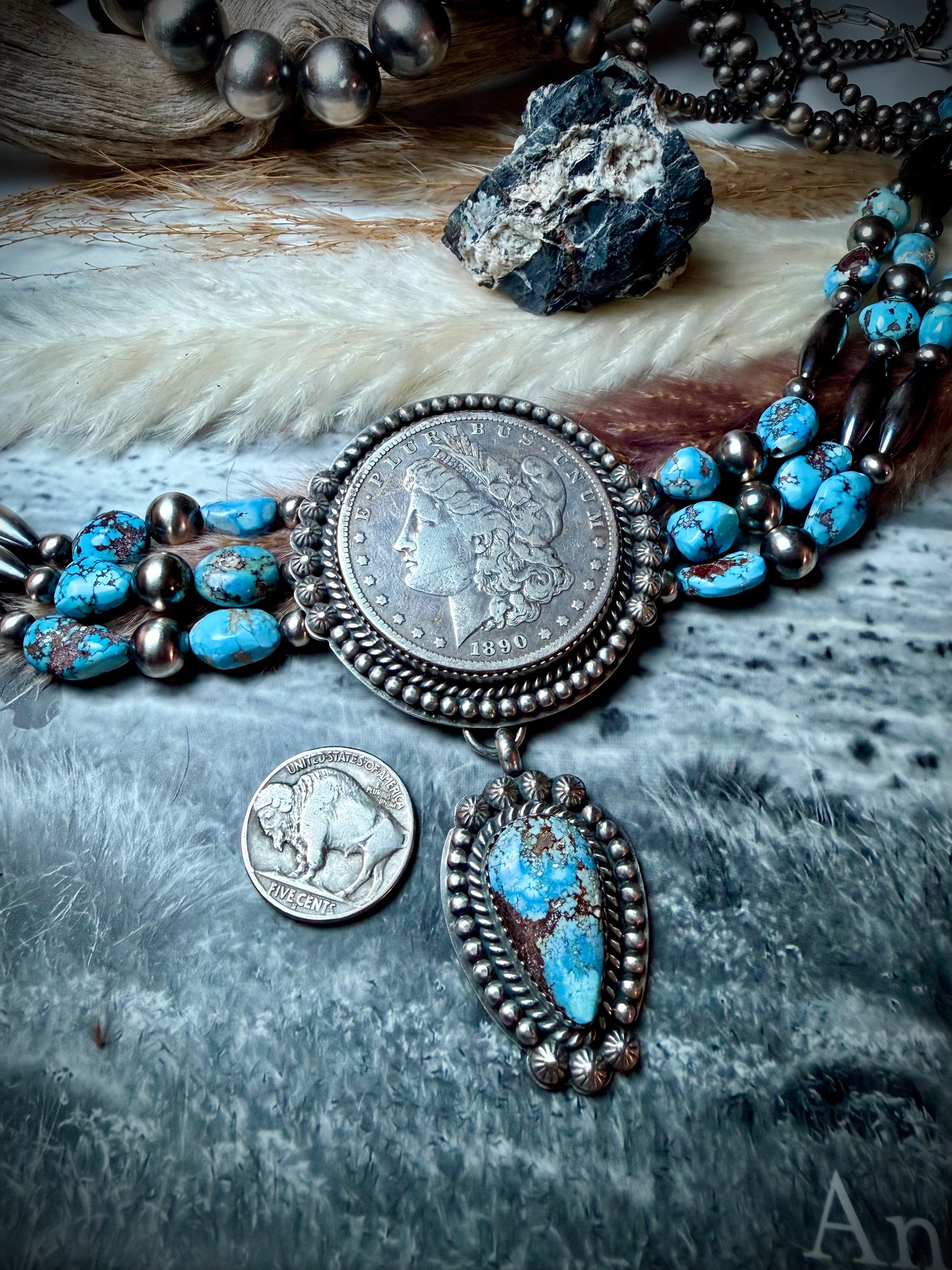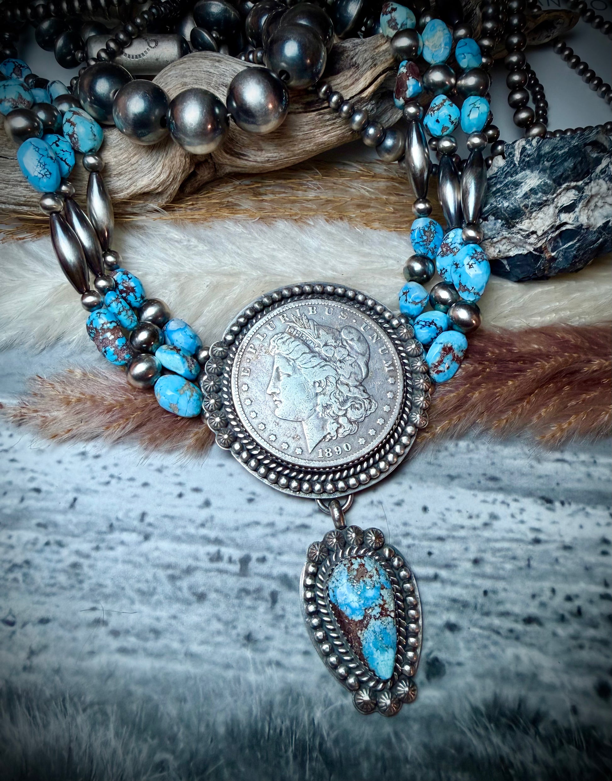 Triple strand Golden Hills beads with a vintage 1890 Morgan Dollar at the center, finished with a dangling Golden Hills drop.