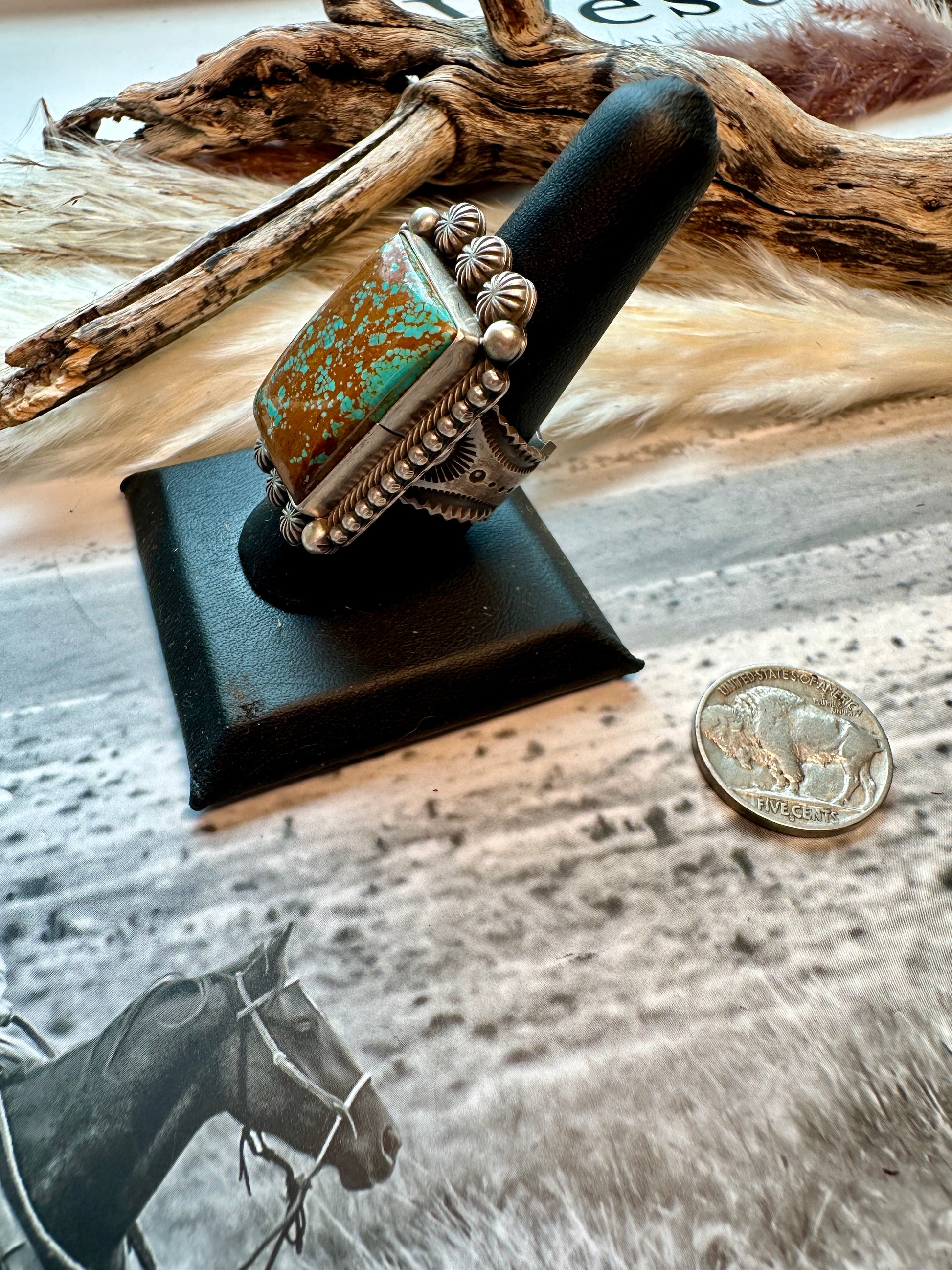 Native made chunky square ring by Rosita Calladitto. Band tapers in the back, so it does fit like a true size 9. This is very similar to one I have in my personal collection, but with a better stamped band!
