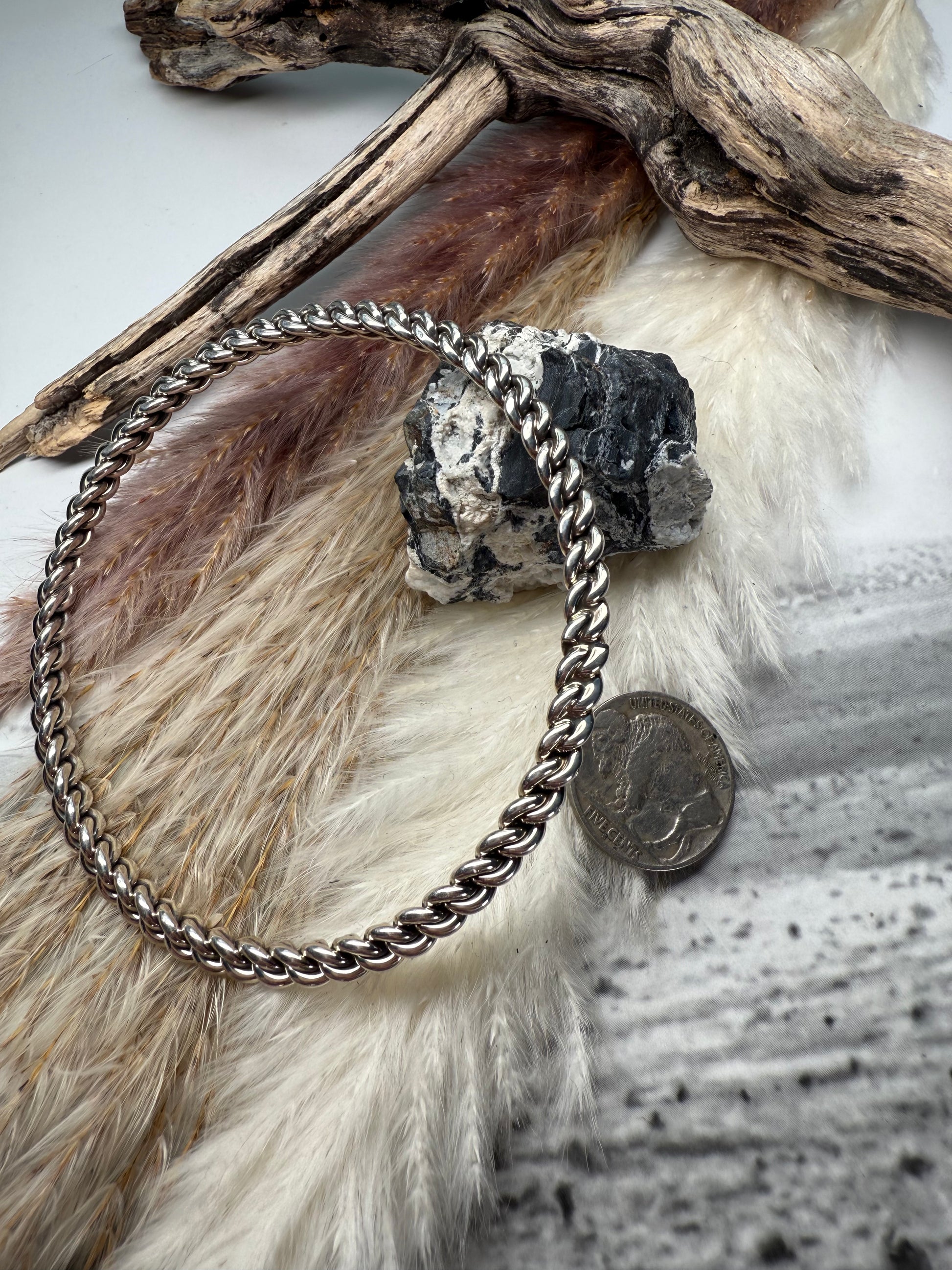 Handcrafted by renowned Navajo silversmith Elaine Tahe, this sterling silver link bangle blends timeless design with artisanal craftsmanship. Its sleek, flexible links move with you, making it a comfortable and stylish piece to wear solo or layered in your favorite stack.