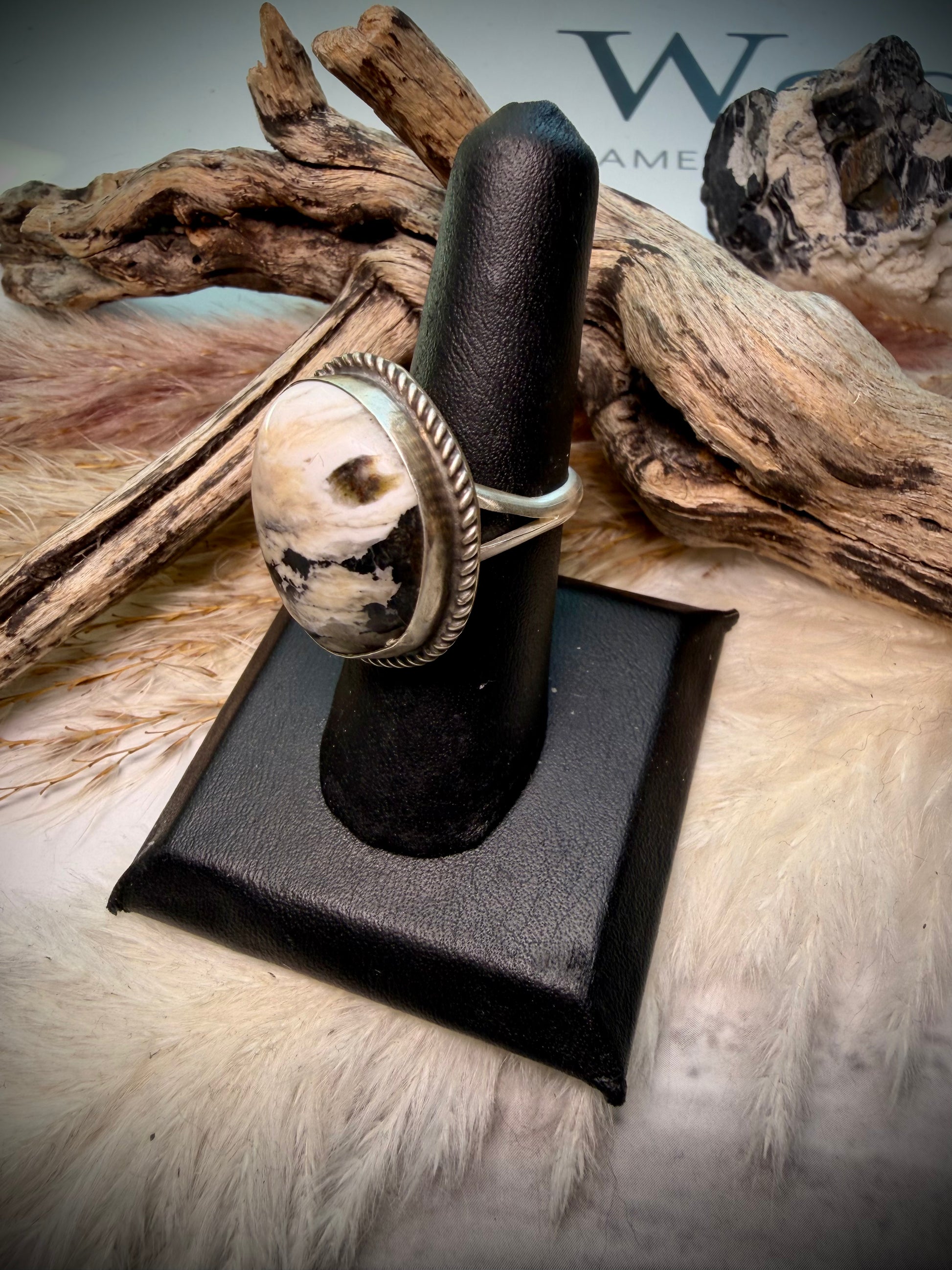 Large round White Buffalo stone with striking black-and-white matrix and warm brown undertones