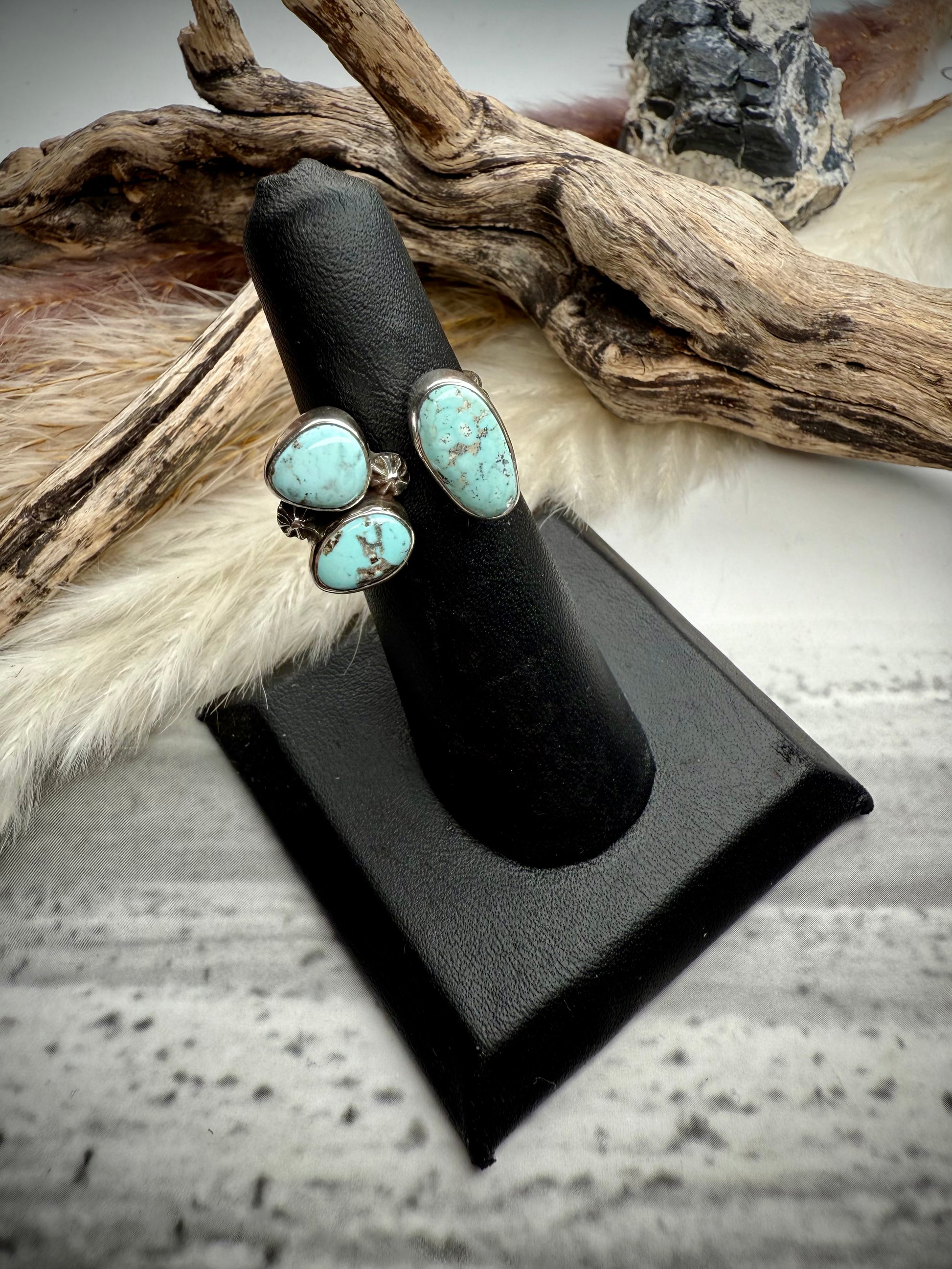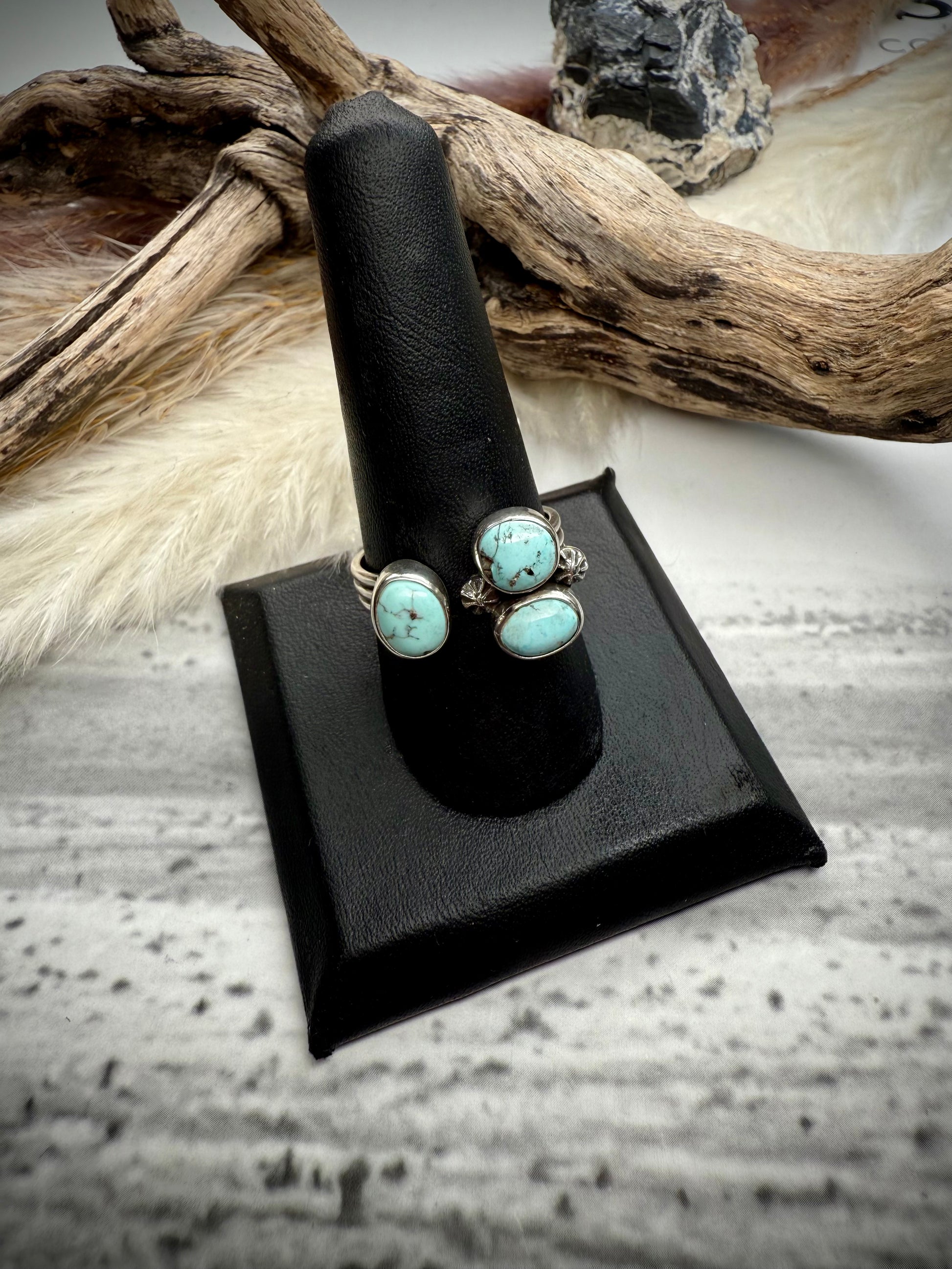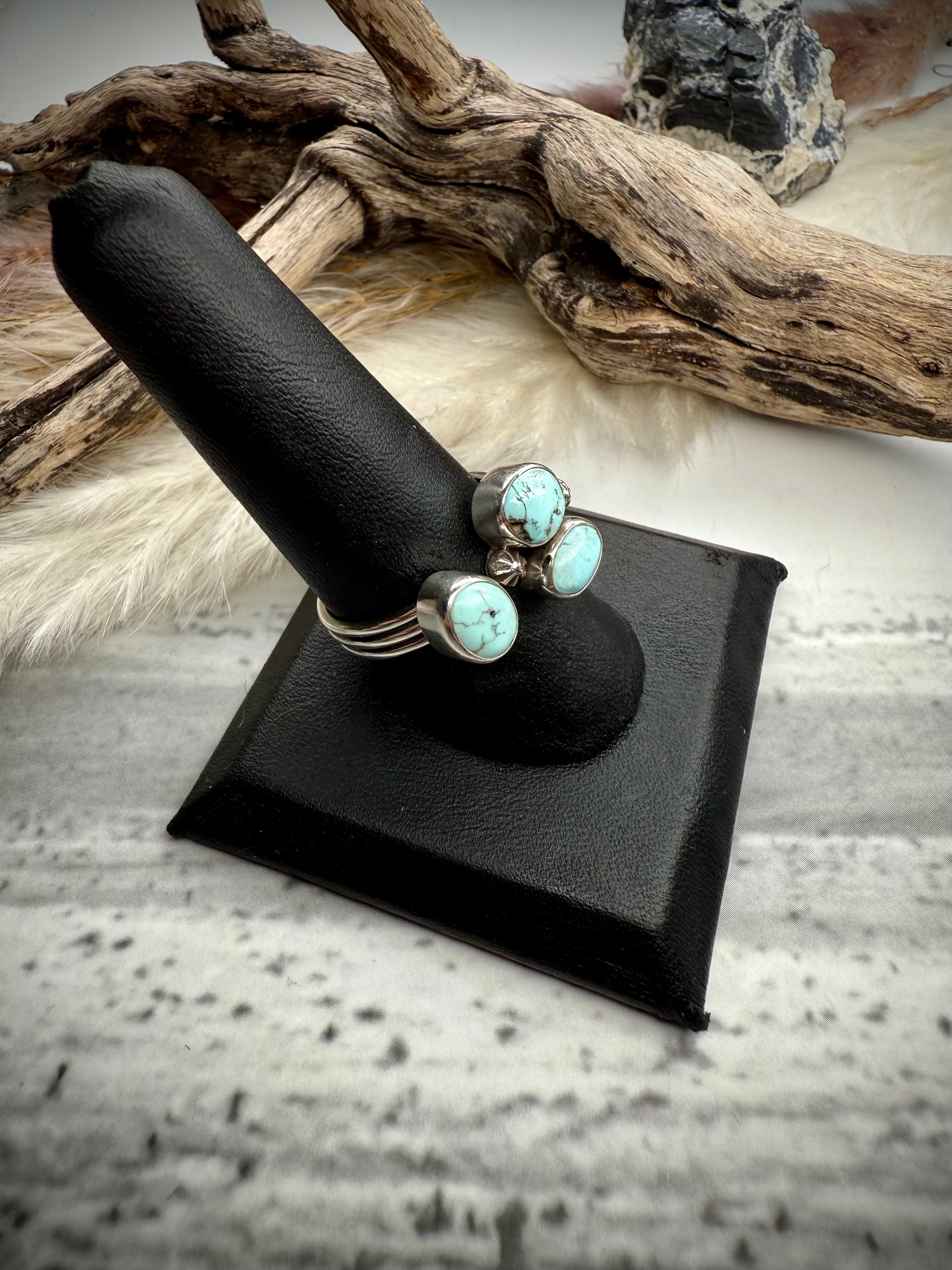 Each handmade sterling silver ring showcases three stunning Dry Creek stones. Slightly adjustable (can size up a bit, but not smaller than listed).
