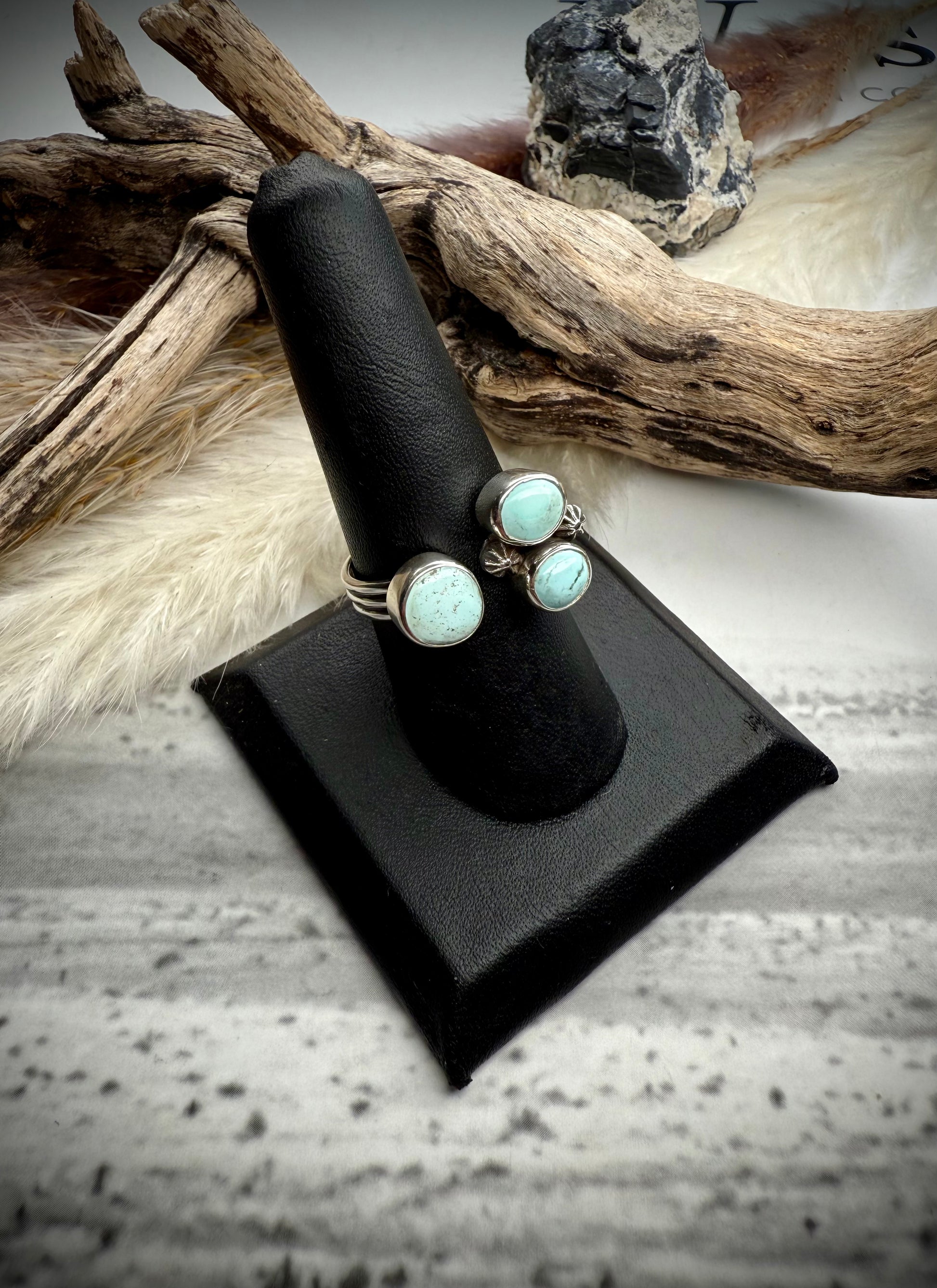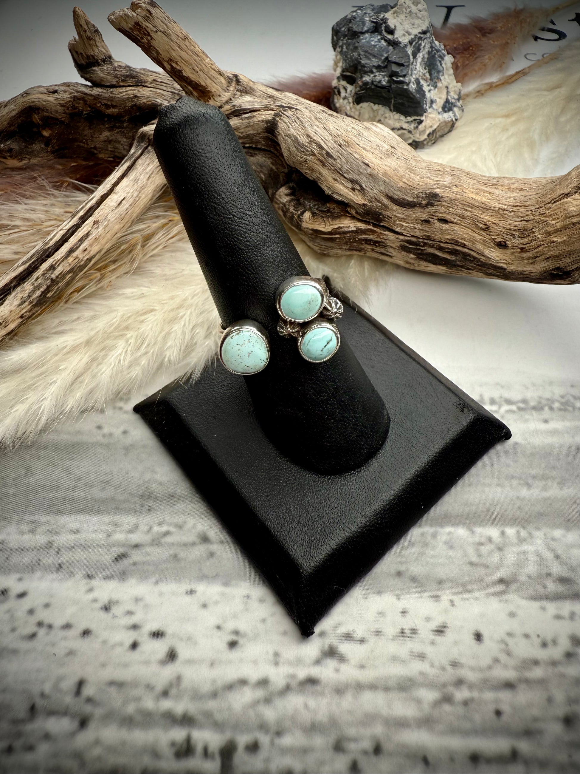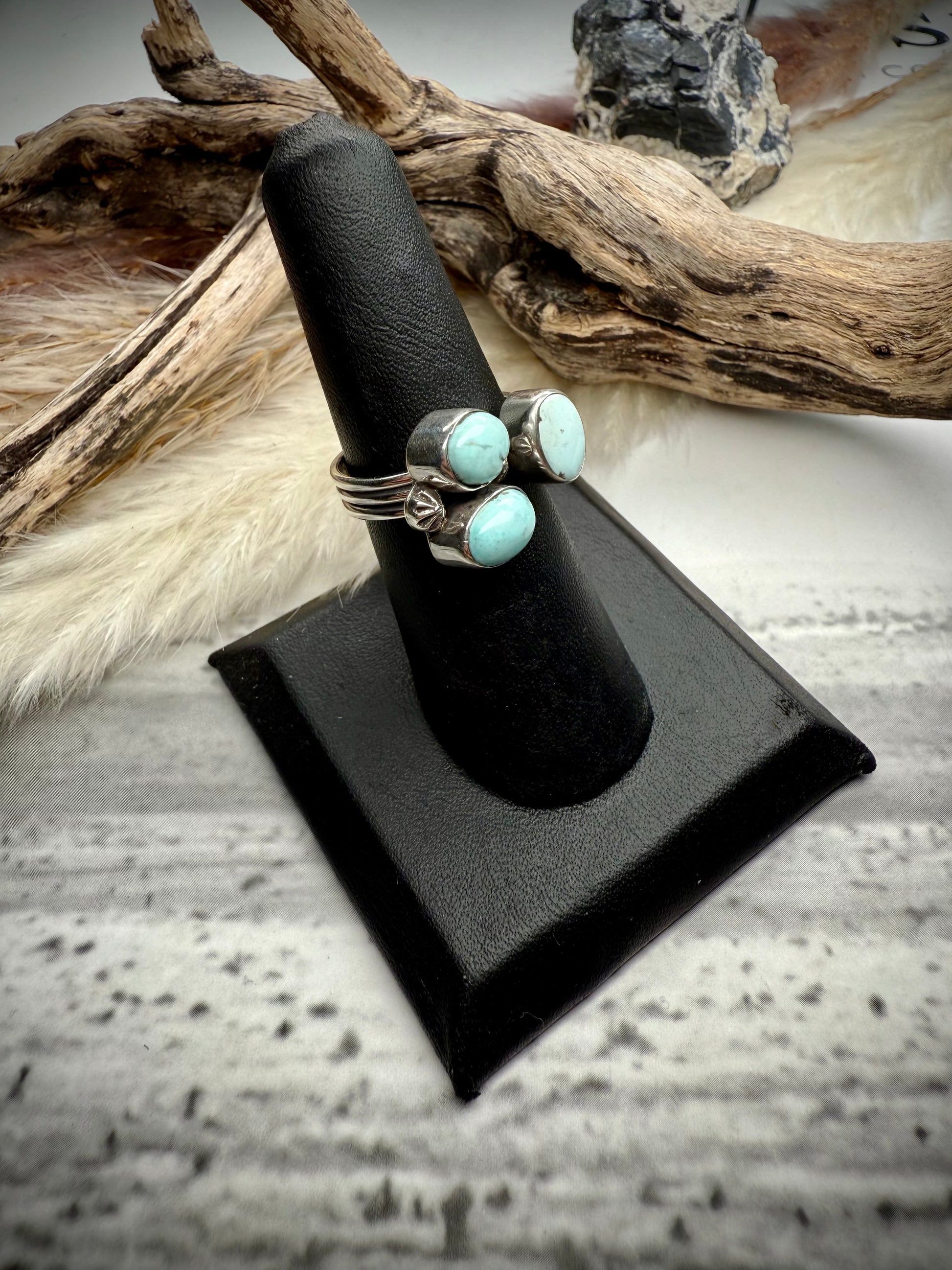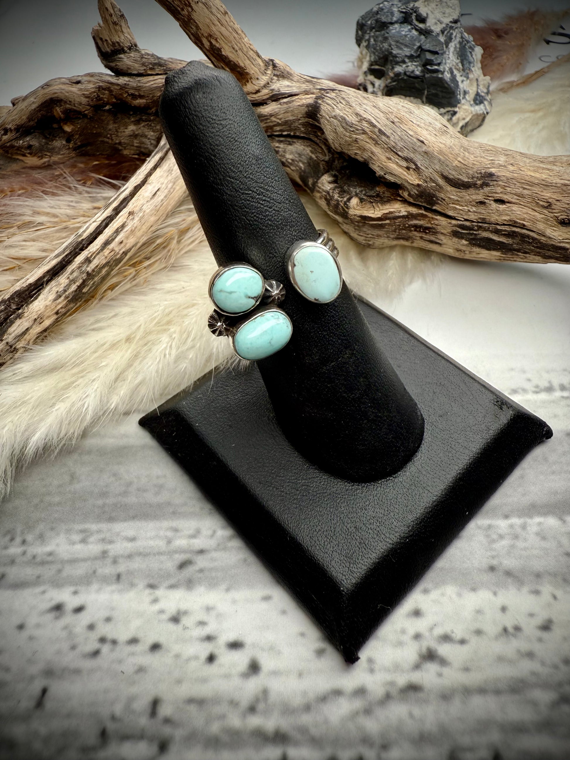 Each handmade sterling silver ring showcases three stunning Dry Creek stones. Slightly adjustable (can size up a bit, but not smaller than listed).