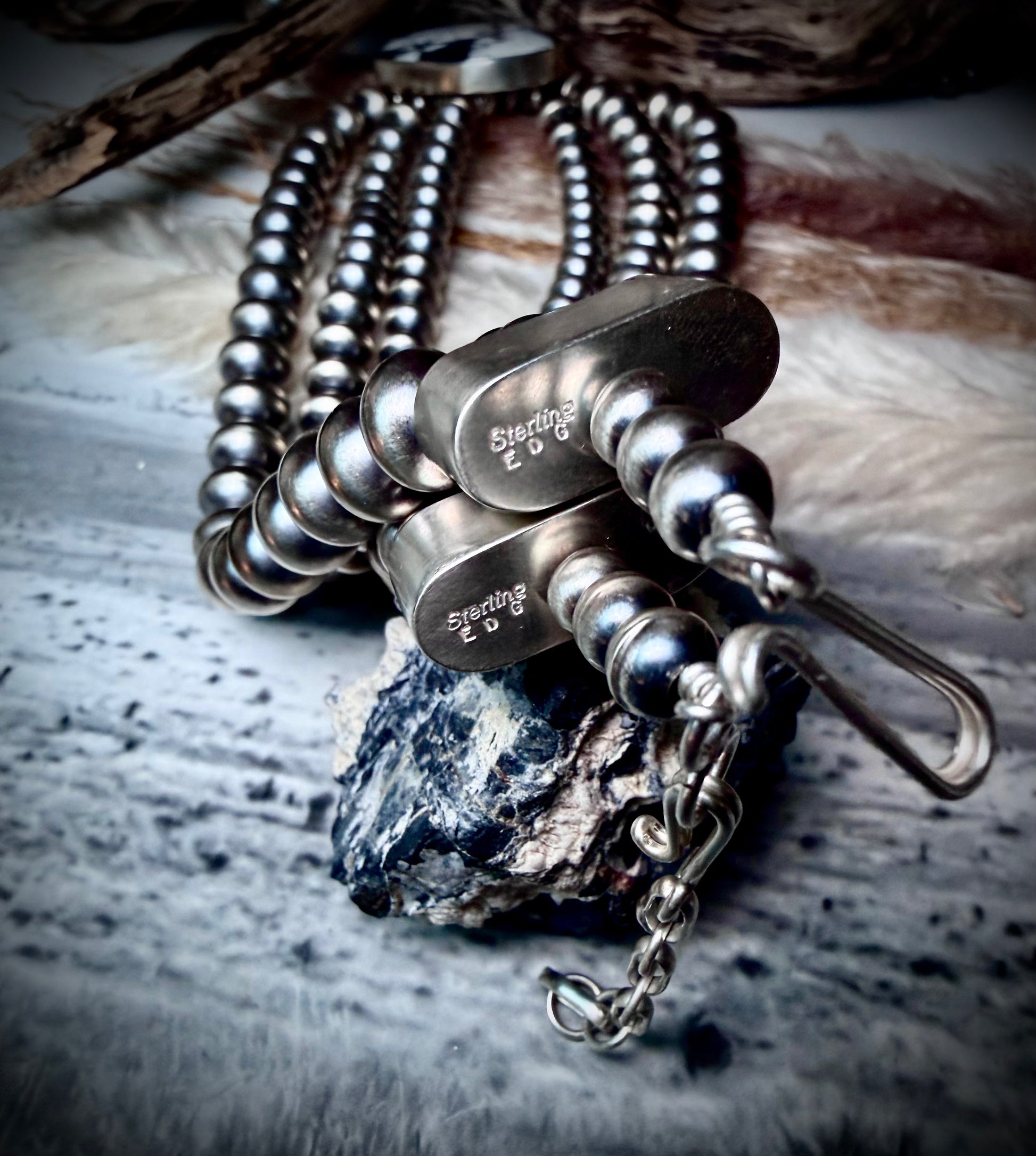 Handmade sterling pearls measure approximately 7.5mm (innermost strand), 9mm (middle strand), and 10mm (outermost strand).